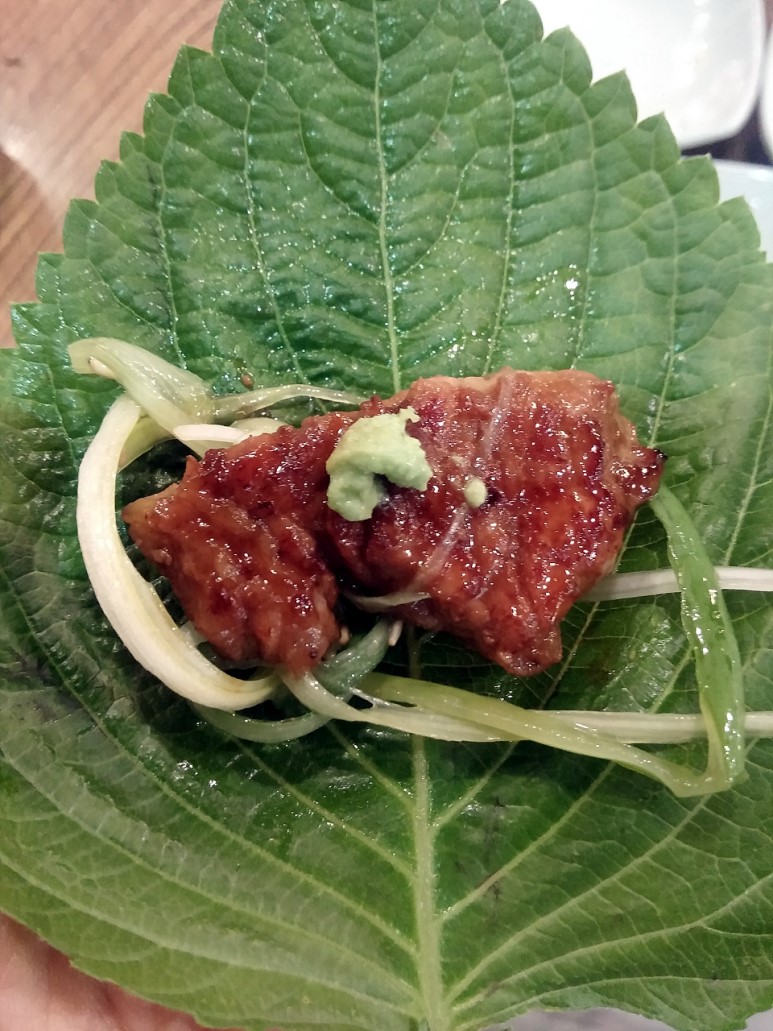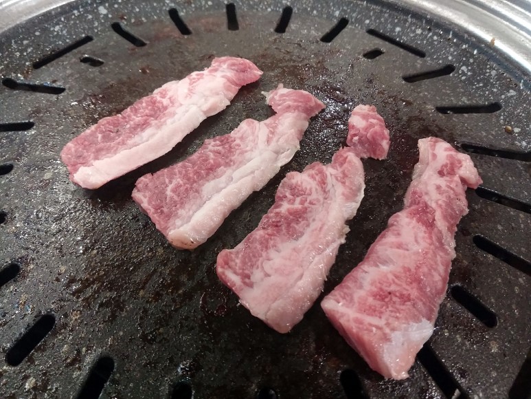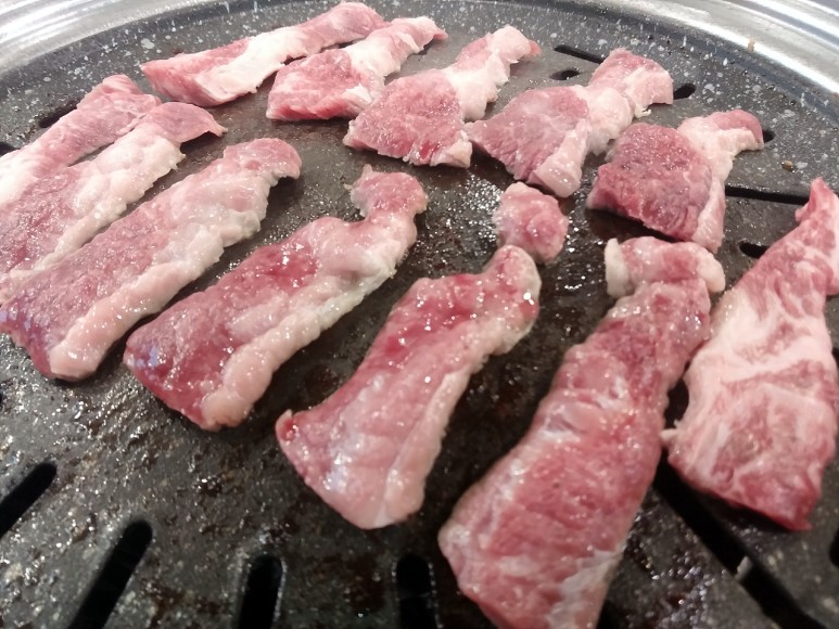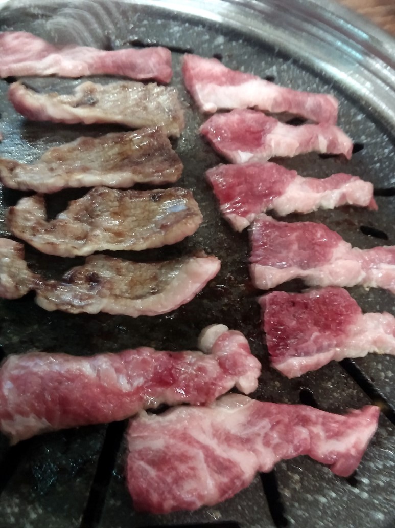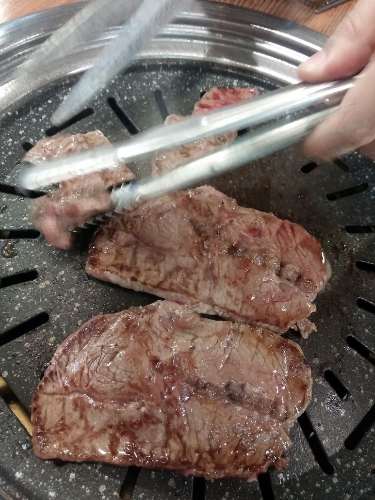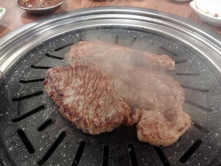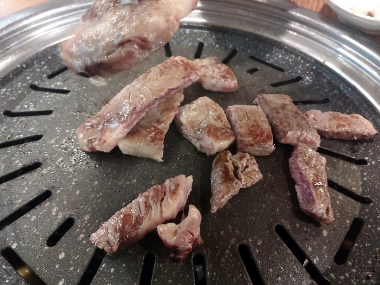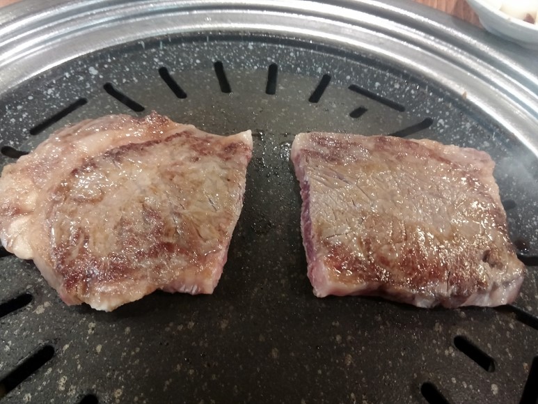 그릇에 담긴 순서대로 구웠는데요. 1번은 숙성 등심입니다. 꽃등심 맛있는 건 알고 있는데 숙성 등심도 못지않더군요. 아마 고기가 좋아서 그럴 텐데요. 사장님도 첫 느낌이 오래간다는 걸 아시는지 처음부터 입맛을 사로잡습니다.